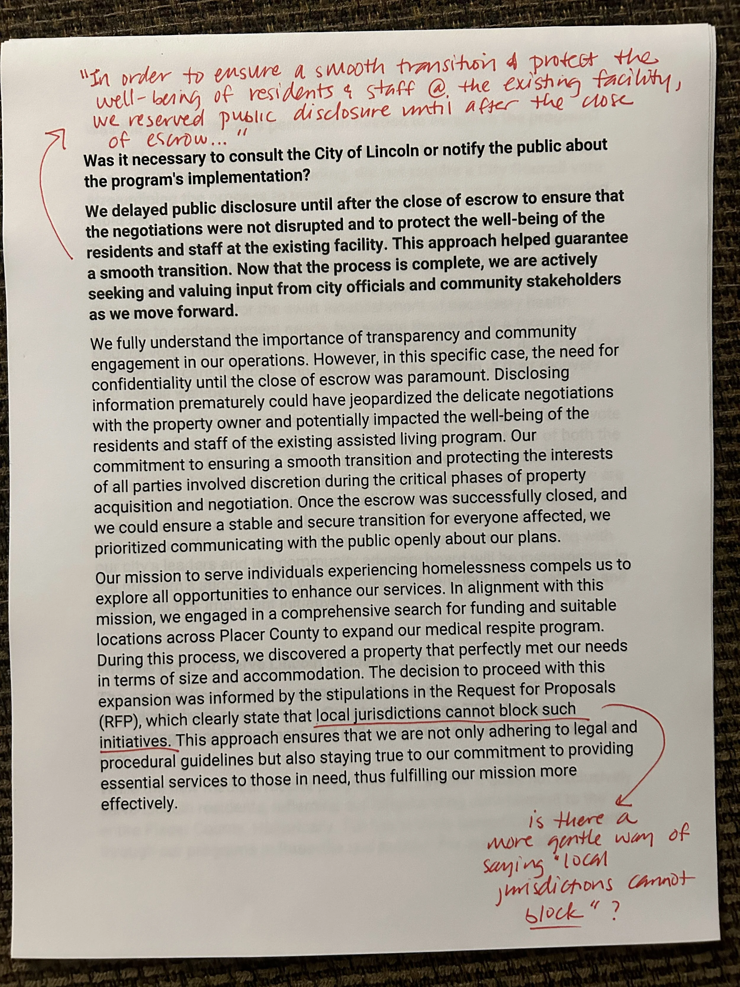 APRIL 2024 Supervisor Landon’s Hand Written Recommendations to TGI re Informing City of Lincoln of Homeless Facility Apr 1 Written By Donelle Collins Donelle Collins